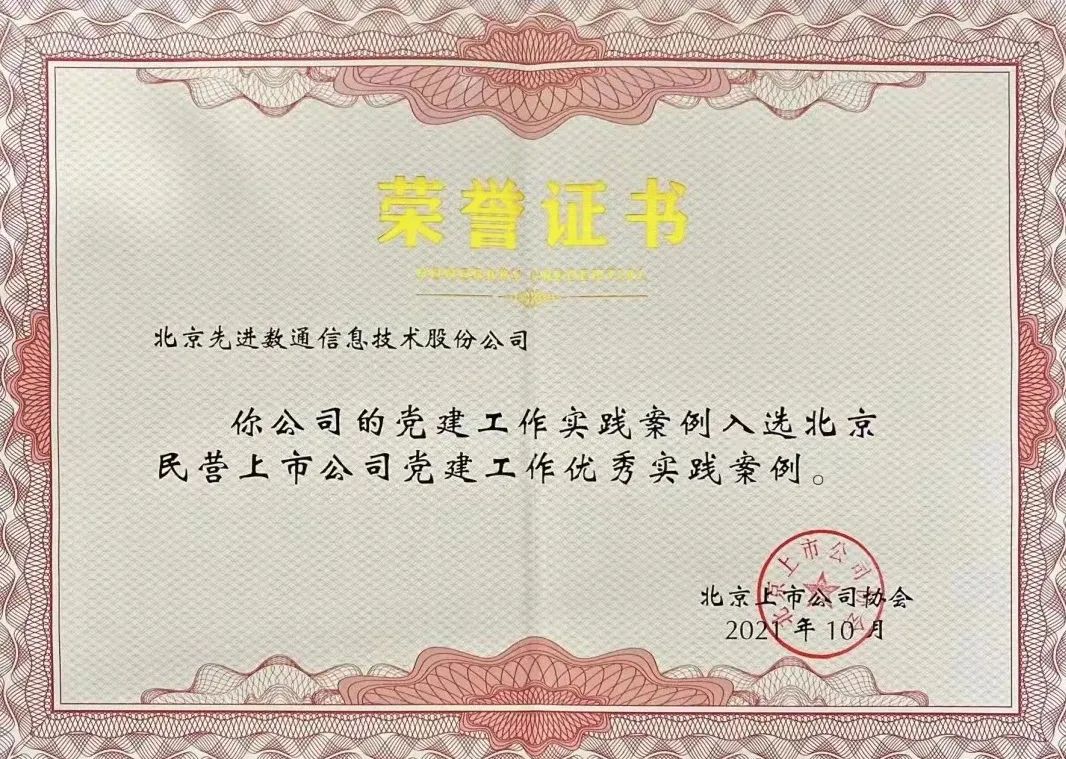 近期,北京上市公司协会授予北京710公海赌赌船官网信息技术股份公司荣誉证书,710公海赌赌船官网党建工作实践入选北京民营上市公司党建工作优秀实践案例,相关党建活动已收录在《北京民营上市公司党建工作优秀实践案例汇编》。