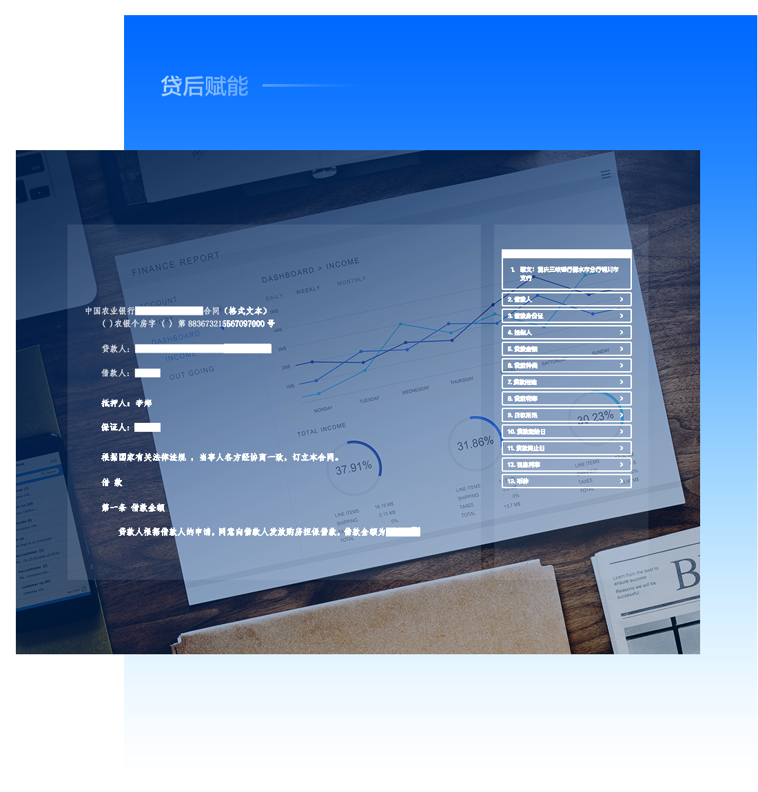A:对公贷款项目在贷后过程中需要不断跟踪项目情况,业务人员需从几十页甚至几百页的项目评估报告中提取和分析关键指标